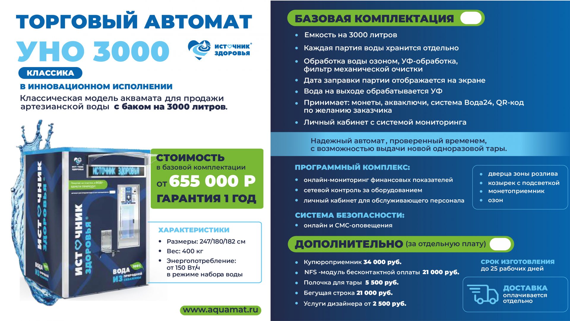 Автомат для продажи полезной артезианской воды с одним вместительным баком. Вместимость аппарата — до 3000 литров воды. Оборудование работает автономно и может быть установлено в местах, где водоснабжение отсутствует. От выбора комплектации зависят дополнительные опции и возможности оборудования. Надежный высокопрочный корпус выдерживает перепады температур от -40 до +40С.