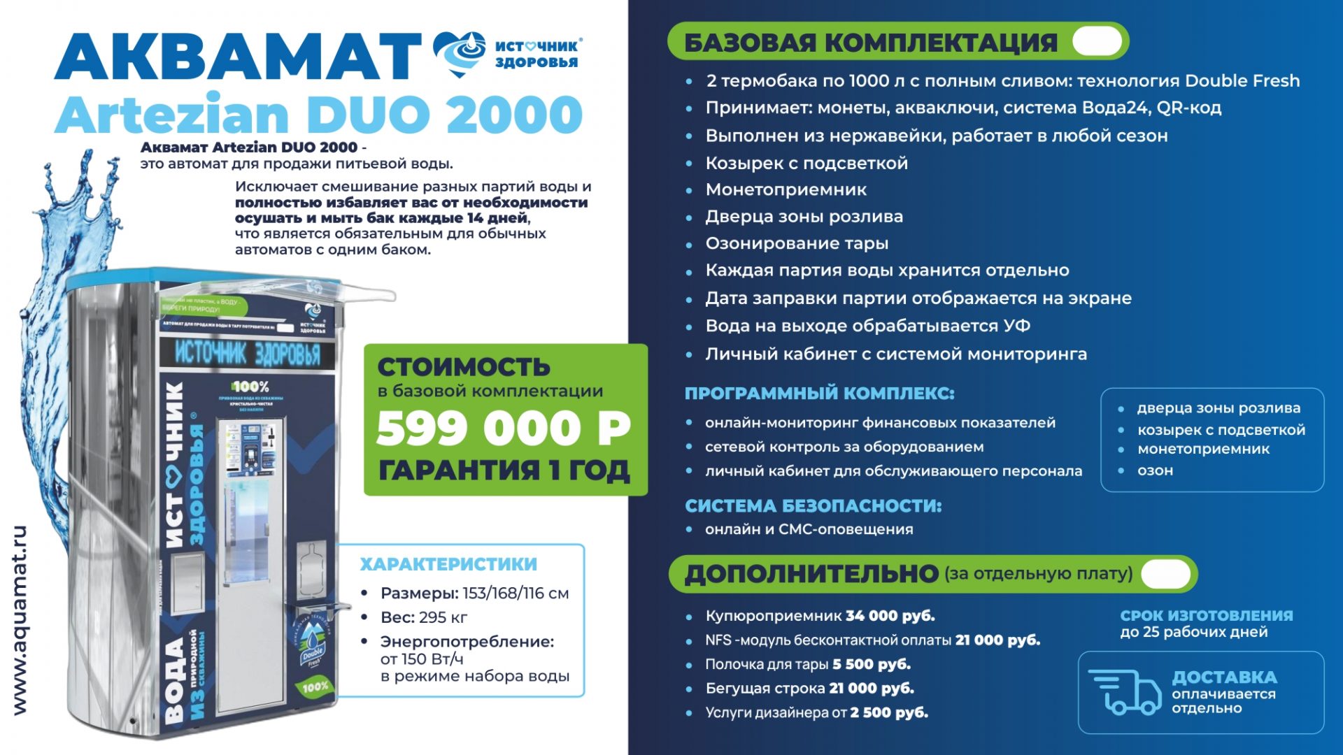 Artezian DUO 2000 (Артезиан ДУО 2000) — Автомат для артезианской воды на 2000 л. с двумя независимыми баками, работающий по уникальной запатентованной технологии Double Fresh, исключающей смешивание разных партий воды.