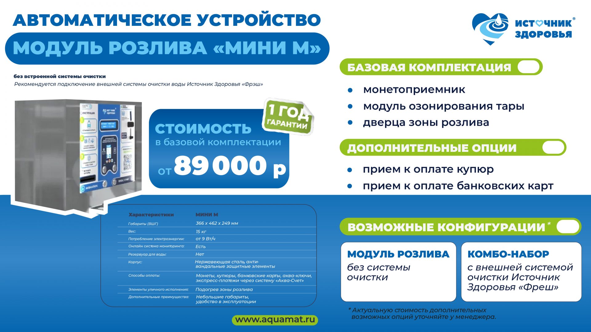 Данный автомат доступен в нескольких версиях: в виде модуля розлива без встроенной системы очистки, а также в виде комбо-набора с внешней системой очистки воды Источник Здоровья «Фрэш».
